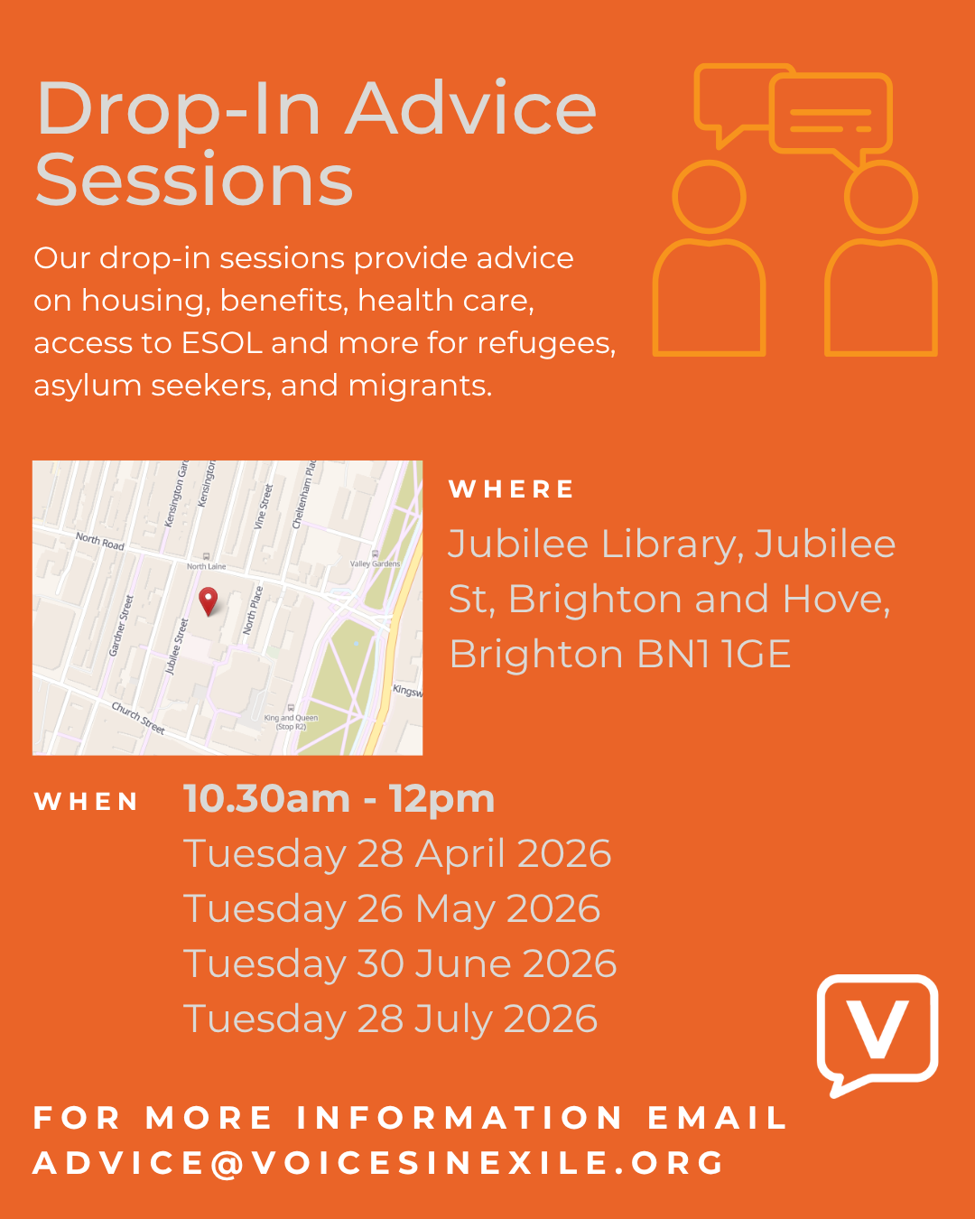 Drop-in advice session providing advice on housing, benefits, health care, access to ESOL and more for refugees, asylum seekers, and migrants.