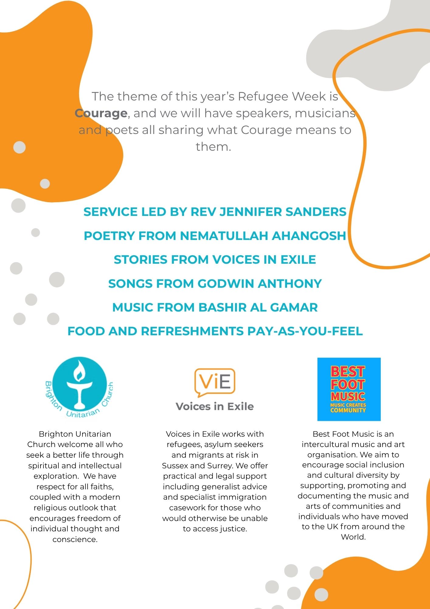 The theme of this year’s Refugee Week is ‘Courage’, and we will have speakers, musicians and poets all sharing what Courage means to them.